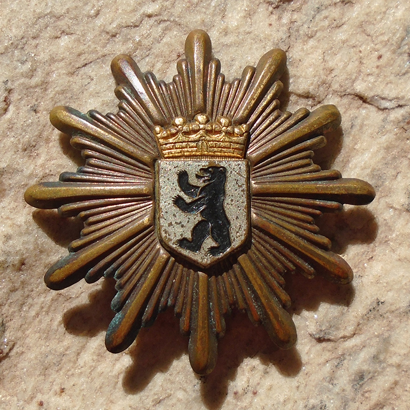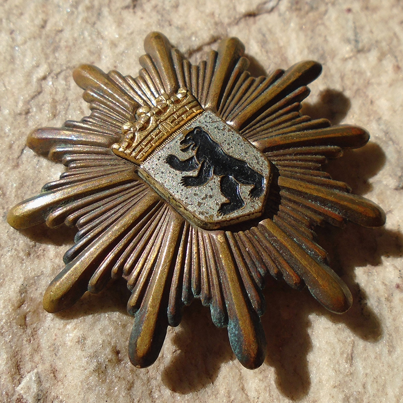 Estado de Conservação: 80%. Insígnia de quepe metálica com o tradicional símbolo da cidade de Berlim. Usado em quepes, com os 4 prongs intactos. Marcação do fabricante “OLC”, mesma marcação de diversas condecorações políticas do pré-Guerra.