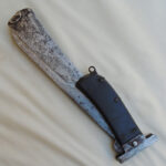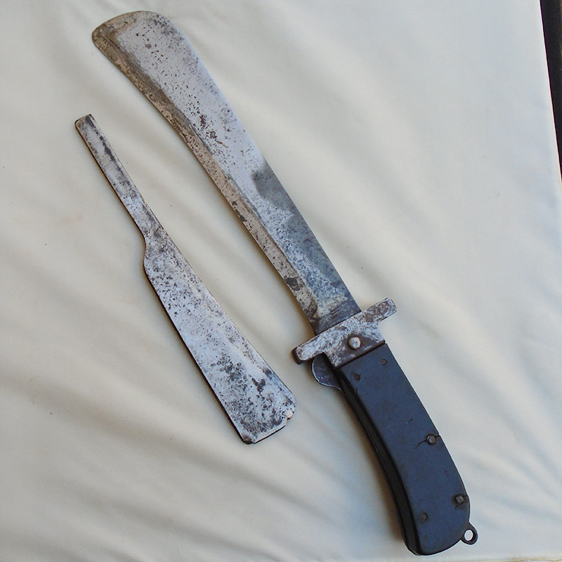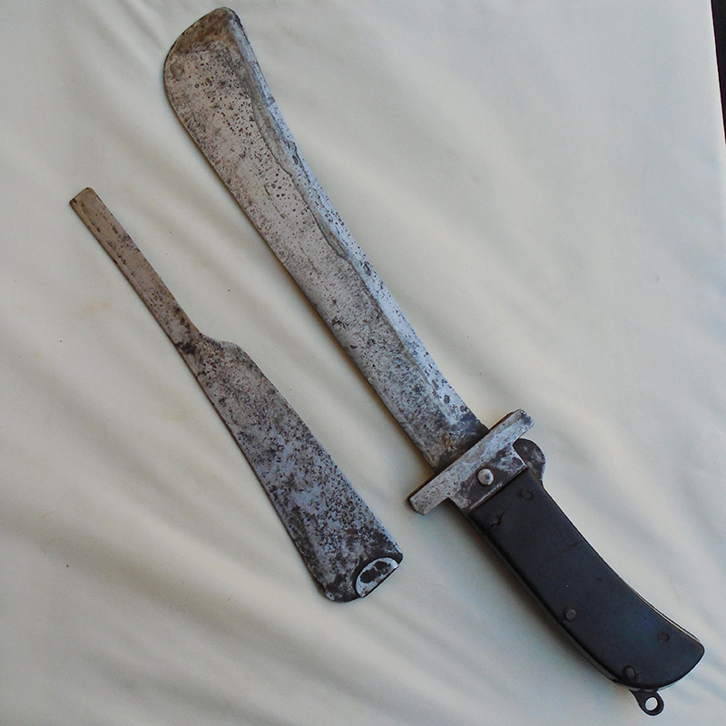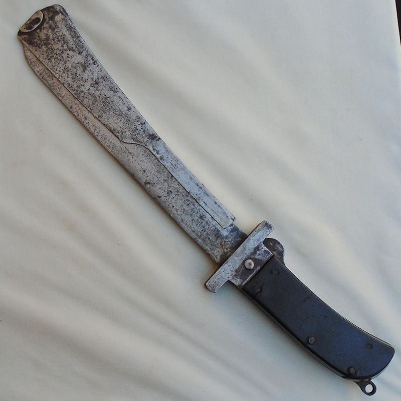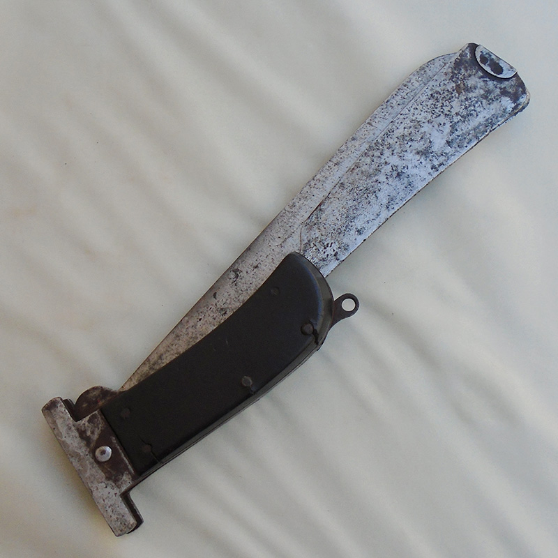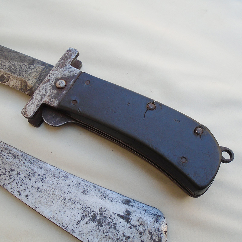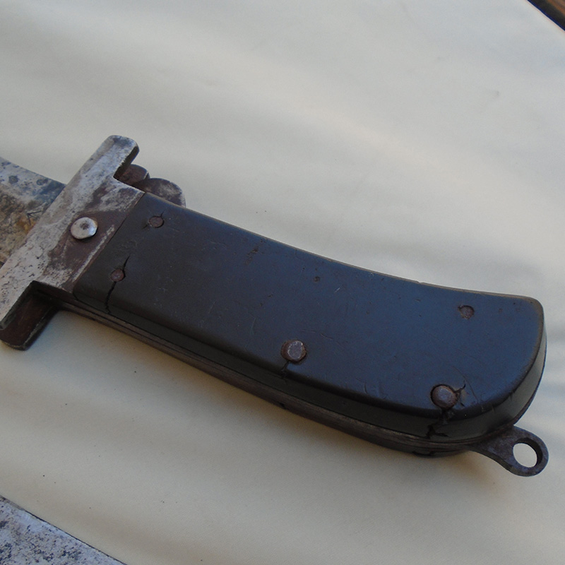Estado de Conservação: 80%, com sinais de uso intenso. Machete completo e plenamente funcional. Não foi reafiado. Marcado com o nome do fabricante “Joseph Westby” do centro cuteleiro de Shefield e com a marcação de prova e o ano 1945. Esta peça ia no interior das aeronaves da RAF, caso as mesmas fizerrem um pouso forçado e a tripulação precisasse sobreviver até a chegada do resgate. EXTREMAMENTE ESCASSA.