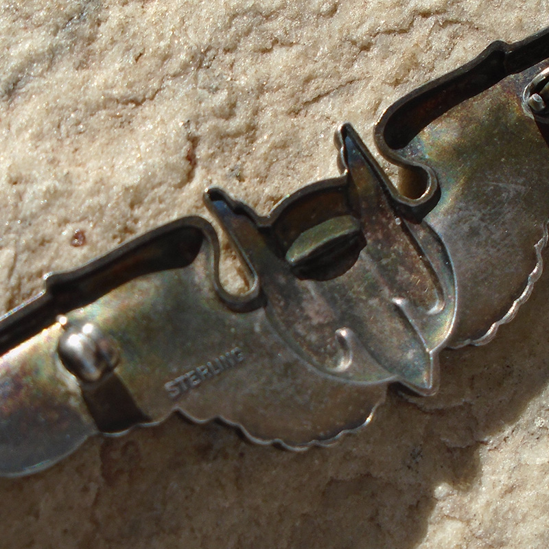 Estado de conservação 85%. Acabamento em prata, não foi polido. Hardware de fixação com pino, dobradiça e presilha, todos funcionais e originais. Marcado “Sterling” no reverso.
