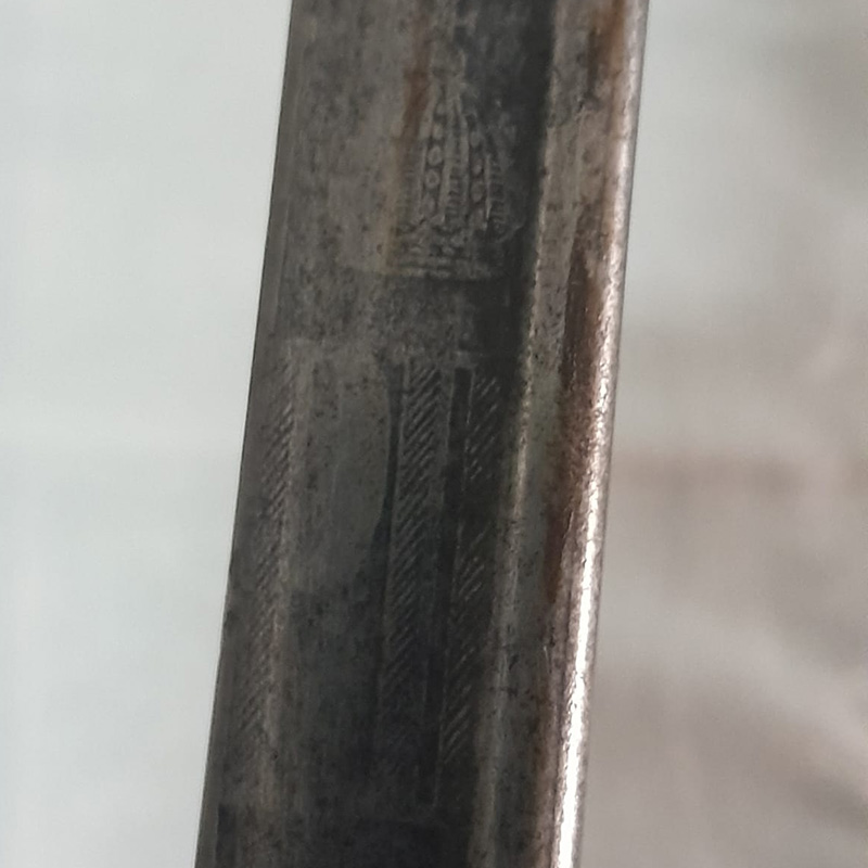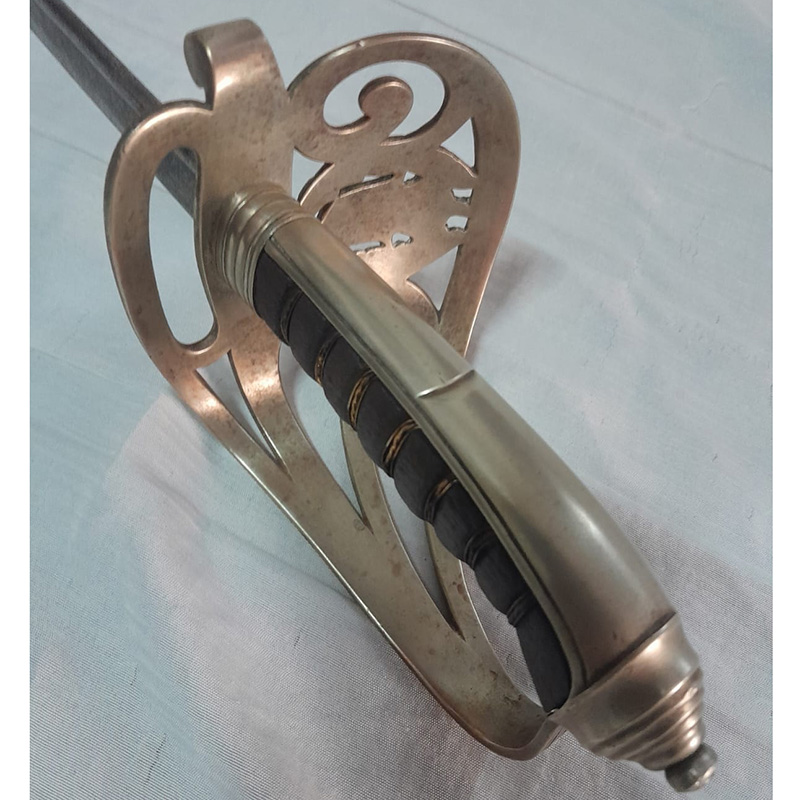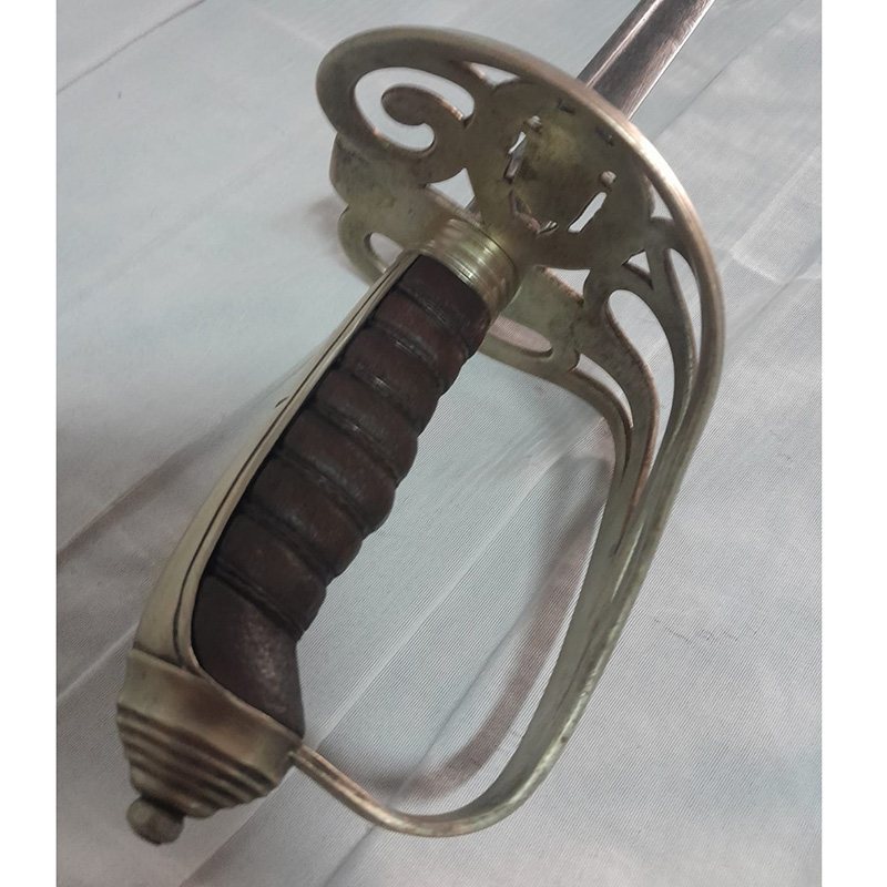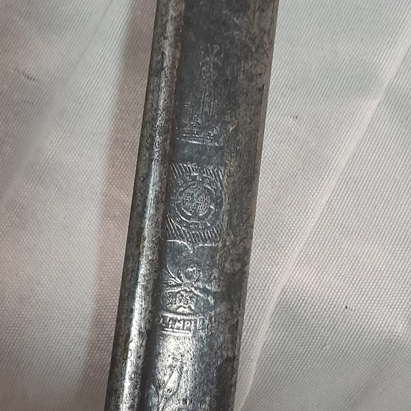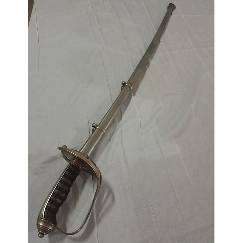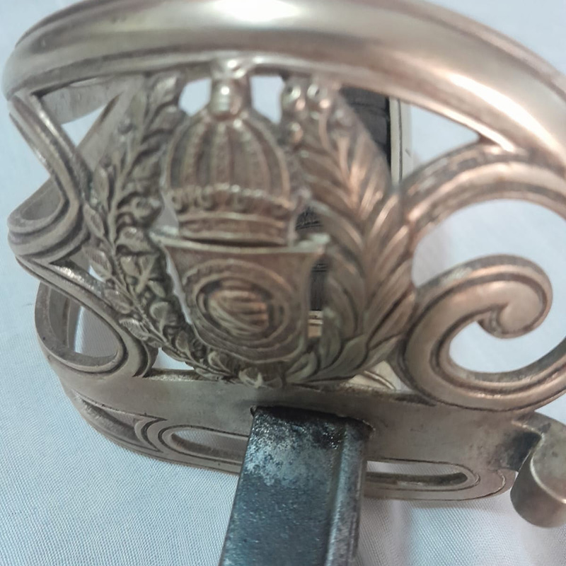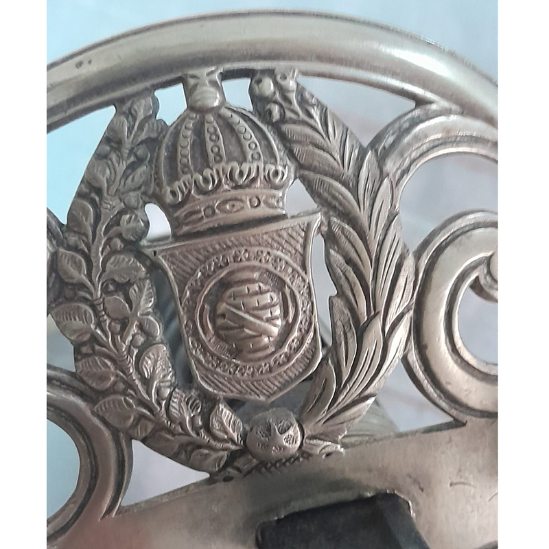 Estado de Conservação: 85%. Espada do último quartel do Século XIX. Lâmina em aço carbono com o monograma PII e o Brasão Imperial Brasileiro com a inscrição (Viva o Imperador). Fabricante alemão “PDL”. Bainha e Guarda em Alpaca com a Coroa Imperial sobre o Brasão. Punho original em maneira sem revestimento.