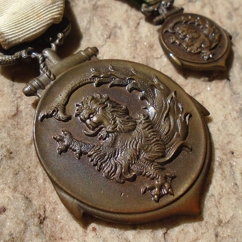 Estado de Conservação: 90% – EXCELLENT!!! Medalha fabricada em bronze, com alguma pátina, mas acabamento bronze visível. Fita original com passante de alfinete de uso em túnica. Acompanha miniatura impecável com fita, muito mais escassa que a medalha.