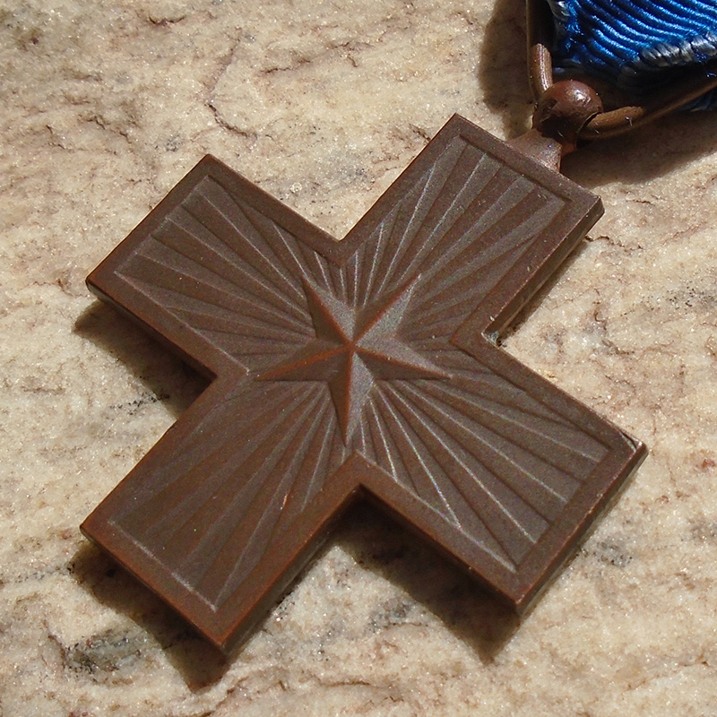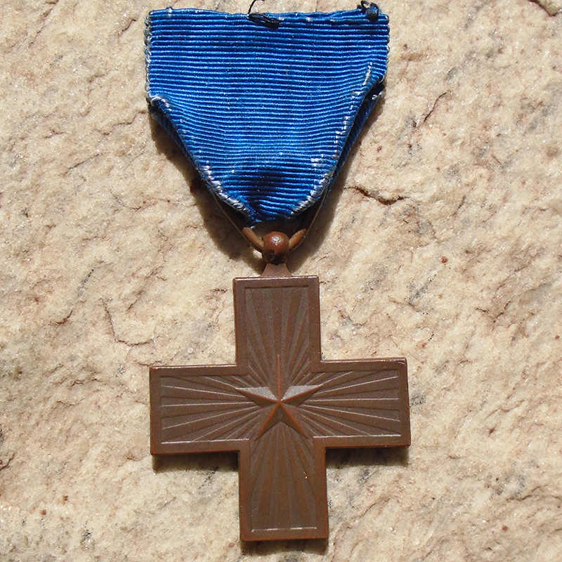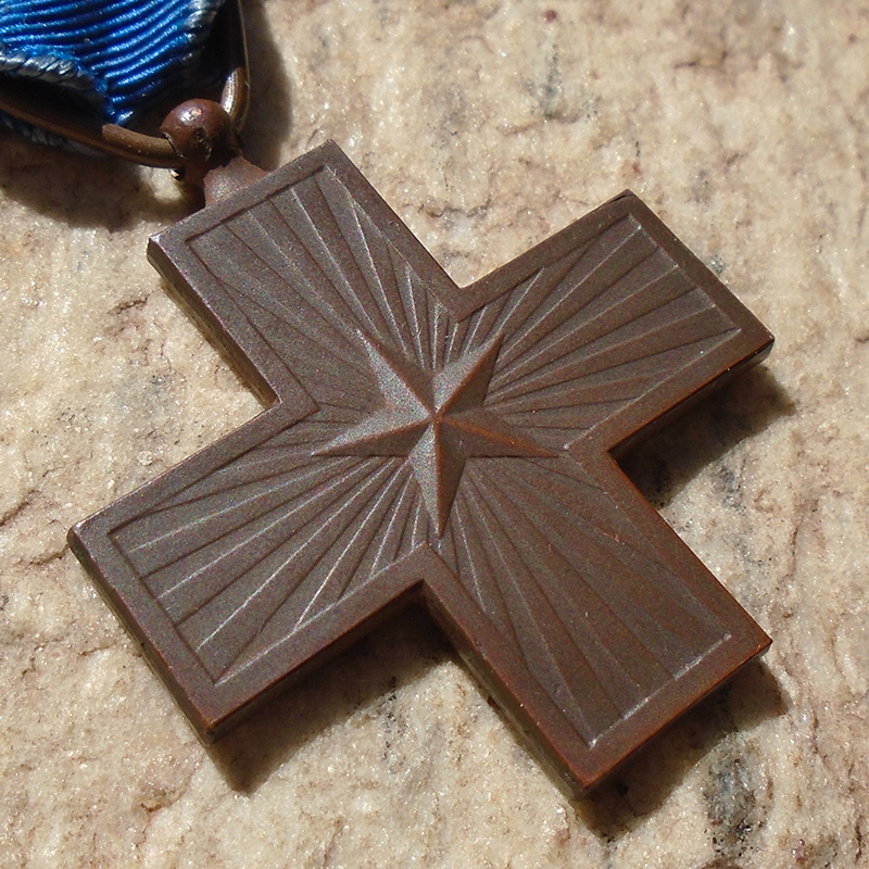Estado de Conservação: 85%. Medalha fabricada em bronze com fita original azul. Versão Tipo II, fabricada durante o período de Guerra, e concedida inclusive para os combatentes da FEB e FAB. Adquirida junto à família de um Febiano que estava no meio do lote de peças da FEB.