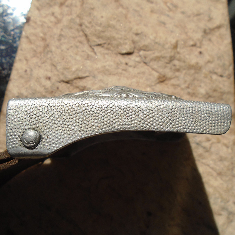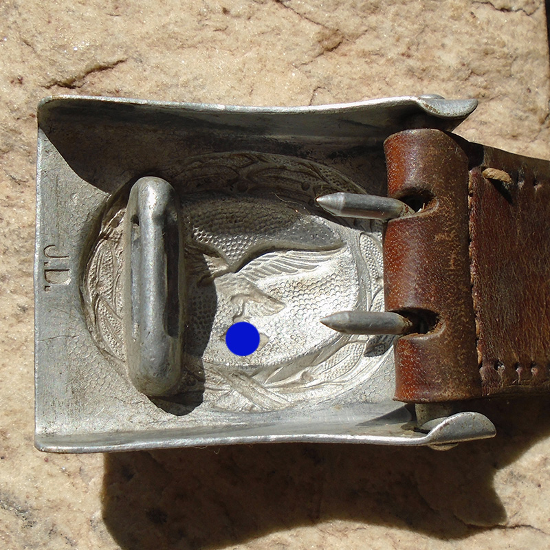 Estado de Conservação: 85%. Fivela early fabricada em alumínio em uma única peça. Segundo modelo da águia da Luftwaffe, produção entre 1937 e 1940. Muito tridimensional. Sinais de uso MUITO intenso, desgaste do alto relevo e das bordas por atrito em uso. Marcada no reverso com as iniciais “J.D.” e o tab de couro com o logotipo de fabricante e o ano de fabricação, 1939.